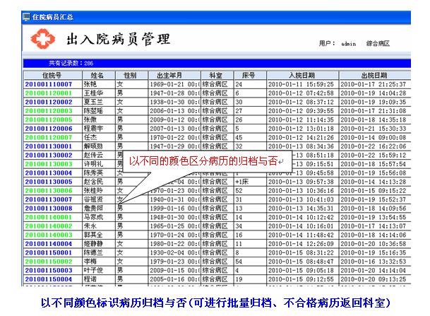 在院病歷查詢/入院記錄查詢/出入院病員管理(以不同顏色分別標(biāo)識(shí)在院、出院未歸檔、已完成歸檔、不合格病歷等)/出院病歷統(tǒng)計(jì)/歷史病歷查詢/ICD-10編碼查詢